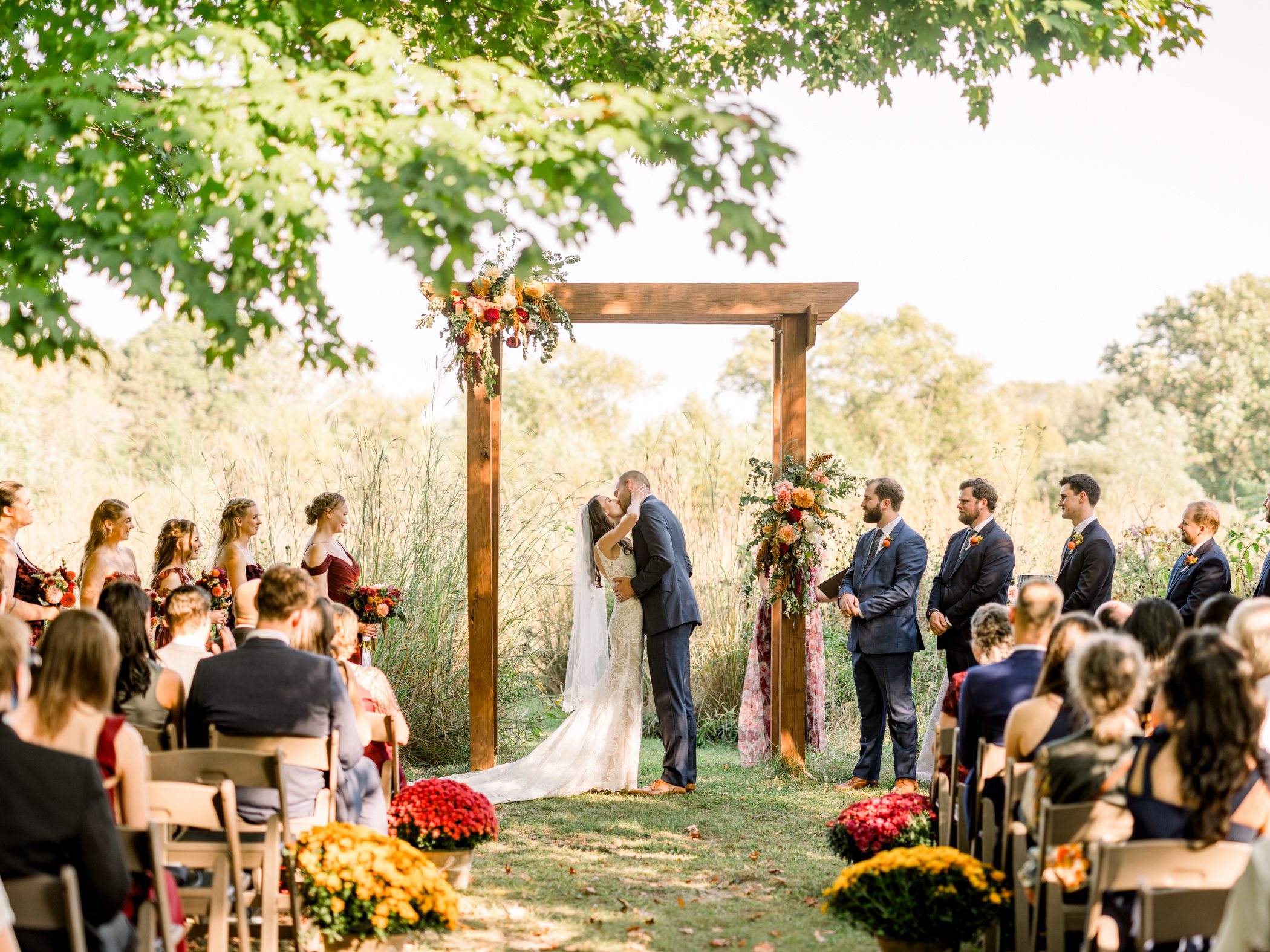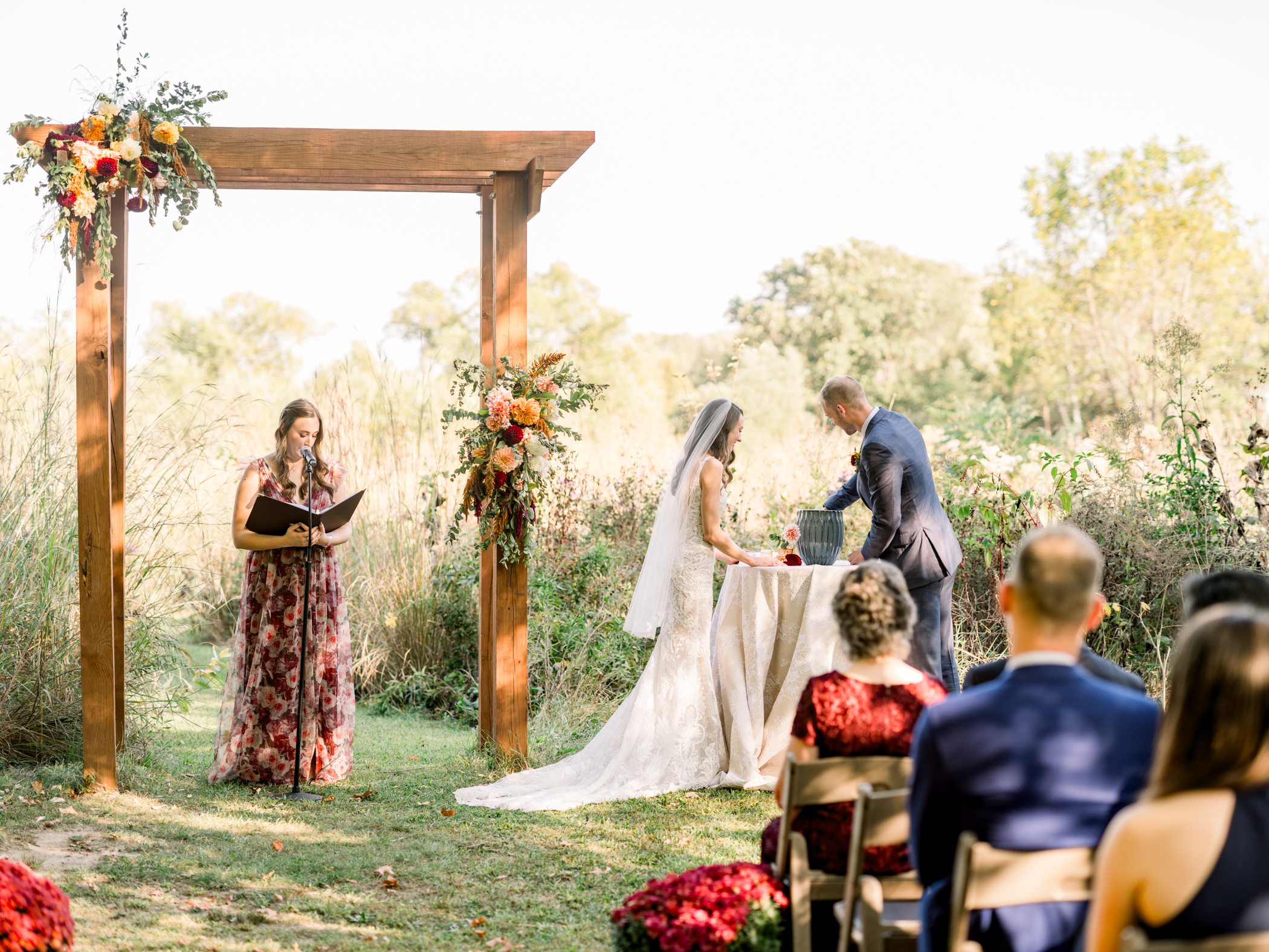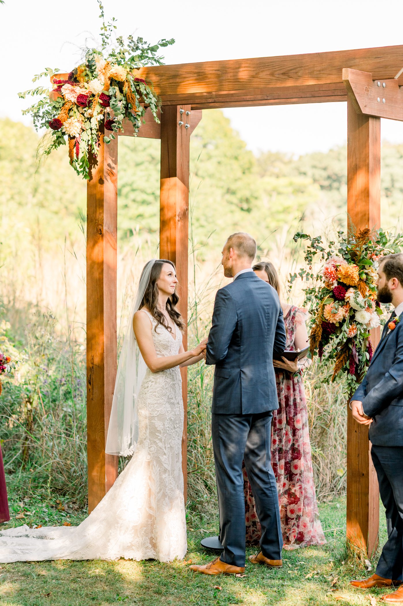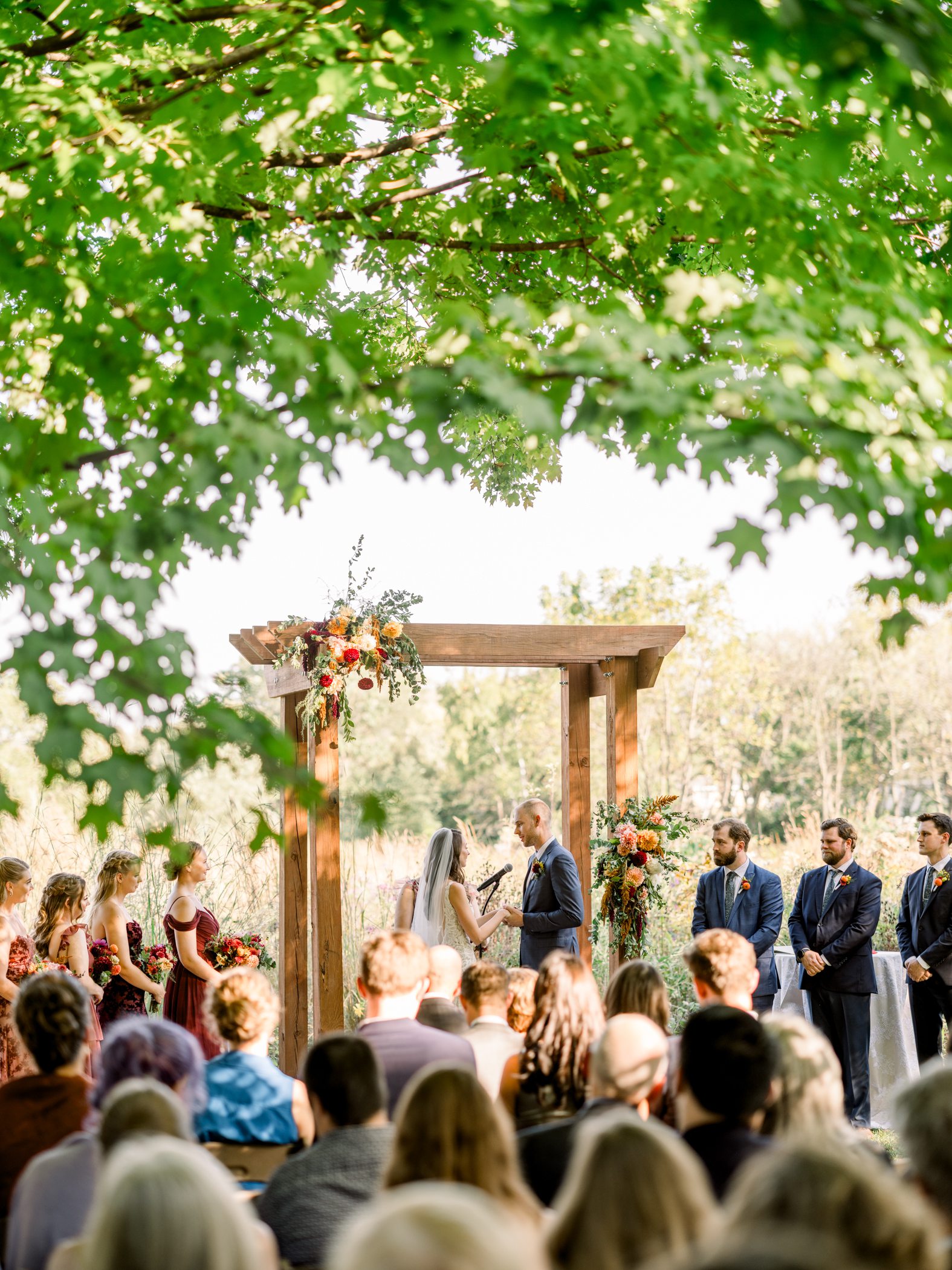 Christina and Andrew exchanged vows under maple trees that overlooked the prairie, mingled on the back patio for cocktail hour, and slow danced in front of the indoor fireplace. It was perfect in all ways!